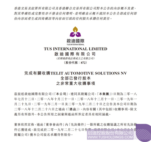2019年2月27日,啟迪國際有限公司(股票代碼: 872.HK,以下簡稱“公司”或“啟迪國際”)發布公告:公司連同其附屬公司收購Telit車載通訊業務之所有先決條件已獲達成,正式完成收購,目標公司及其附屬公司成為啟迪國際的全資子公司。在此之前的2018年7月12日,啟迪國際宣布以1.05億美元(約8.24億港元)收購Telit車載通訊業務,進一步強化集團智能駕駛系統業務布局。
