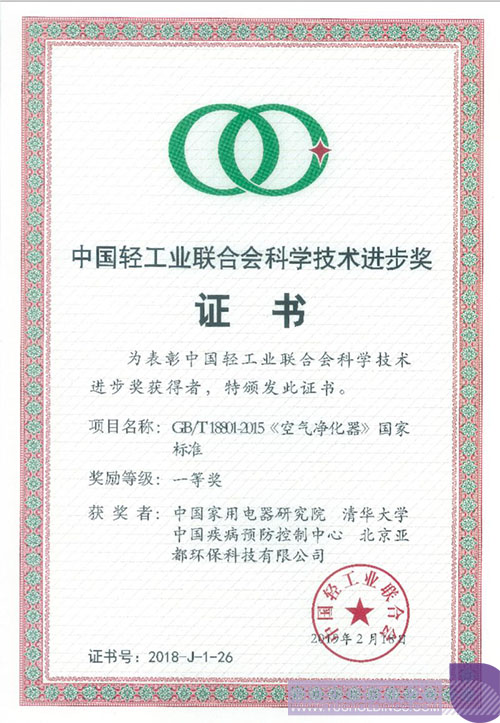 3月21日,中國(guó)輕工業(yè)聯(lián)合會(huì)四屆五次理事會(huì)在廣西南寧舉行。會(huì)議表彰了2018年度中國(guó)輕工業(yè)聯(lián)合會(huì)科學(xué)技術(shù)獎(jiǎng)的獲獎(jiǎng)組織和個(gè)人,由啟迪控股成員企業(yè)—亞都、中國(guó)家電研究院、清華大學(xué)、中國(guó)疾控中心聯(lián)合起草制定的“GB/T18801-2015《空氣凈化器》國(guó)家標(biāo)準(zhǔn)”項(xiàng)目榮獲2018年度中國(guó)輕工業(yè)聯(lián)合會(huì)科學(xué)技術(shù)進(jìn)步一等獎(jiǎng),亞都作為該標(biāo)準(zhǔn)的主要起草單位,成為唯一獲得此項(xiàng)獎(jiǎng)勵(lì)的企業(yè)單位。