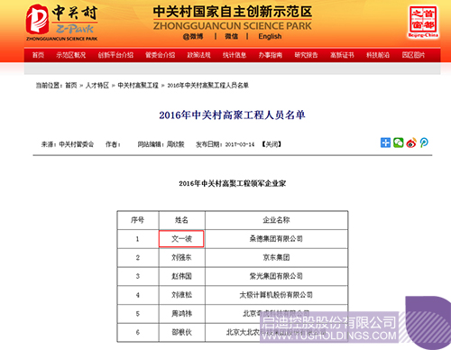 近日,2016年中關村高聚工程人員名單公布。名單包括領軍企業家、創新領軍人才、創業領軍人才、投資家、創新創業服務業領軍人才,共53人入選。啟迪桑德董事長文一波入選“2016年中關村高聚工程領軍企業家”。