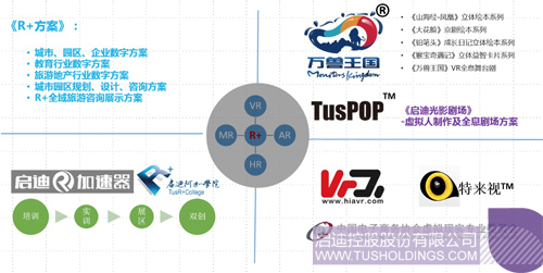 “R+”世界內容上融合了虛擬現實VR、增強現實AR、混和現實MR、全息現實HR,并在此基礎之上打造出以應用服務為支撐的啟迪R加速器、啟迪阿加學院、VR網、ECVR(虛擬現實專業委員會)以及“R+”全息世界數字創意解決方案,應用領域涵蓋政府及產業園區、旅游及地產、教育等行業的“R+”平臺。