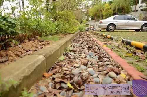 滲透溝利用透水植草磚、鵝卵石滲透溝,使雨水自然下滲并流到旁邊市政綠化帶上。