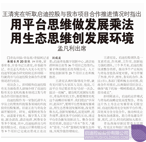 青島日報6月21日頭版報道: 19日晚,省委常委、市委書記王清憲,市委副書記、市長孟凡利在八大關小禮堂與啟迪三螺旋研究院院長彭頃砡一行就我市與啟迪控股全面合作進展情況進行座談。