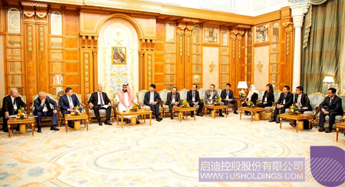 啟迪控股董事、啟迪國際董事長馬志剛(右八)代表啟迪控股出席與沙特王儲穆罕默德·本·薩勒曼(左五)對話的企業(yè)家座談會