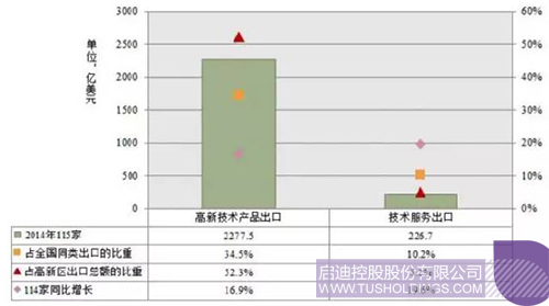國家高新區積極鼓勵企業開拓和利用國際市場,通過重點發展高附加值的高新技術產品和技術服務出口,優化和升級出口貿易結構,在激烈的國際競爭市場占有一席之地。2014年國家高新區企業高新技術產品出口總額達2,277.5億美元,占全國高新技術產品出口比重的34.5%,同比增長16.9%。企業實現技術服務出口總額226.7億美元,占全國服務出口比重達10.2%,同比增長達19.6%。