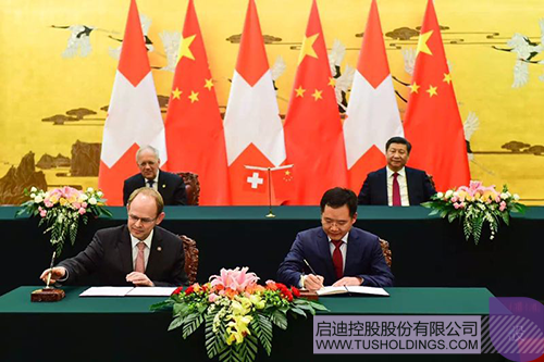 2016年4月,中國國家主席習近平與瑞士國家主席施耐德·阿曼共同見證啟迪控股董事長王濟武(前排右)與瑞士國家創(chuàng)新園簽署合作協(xié)議